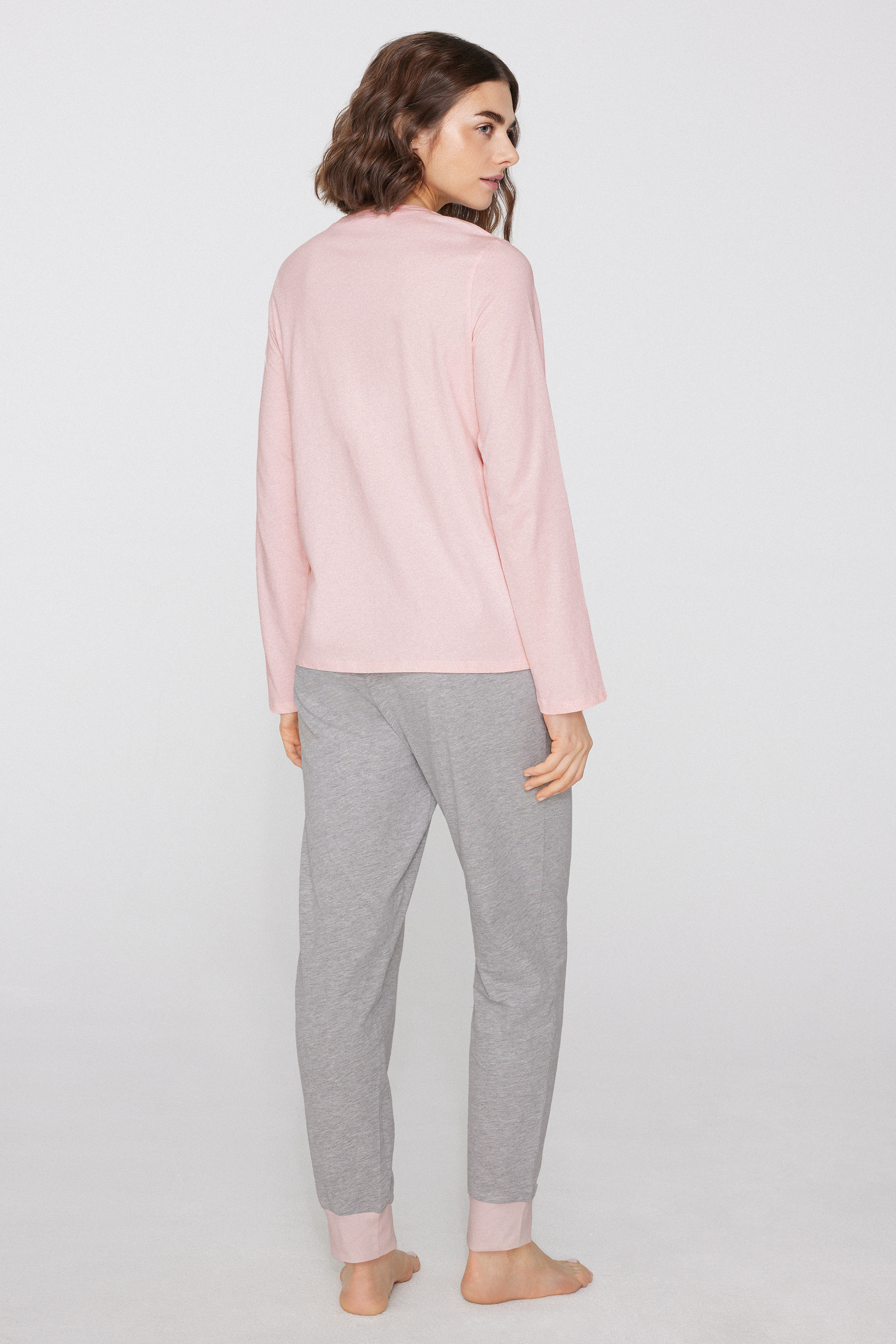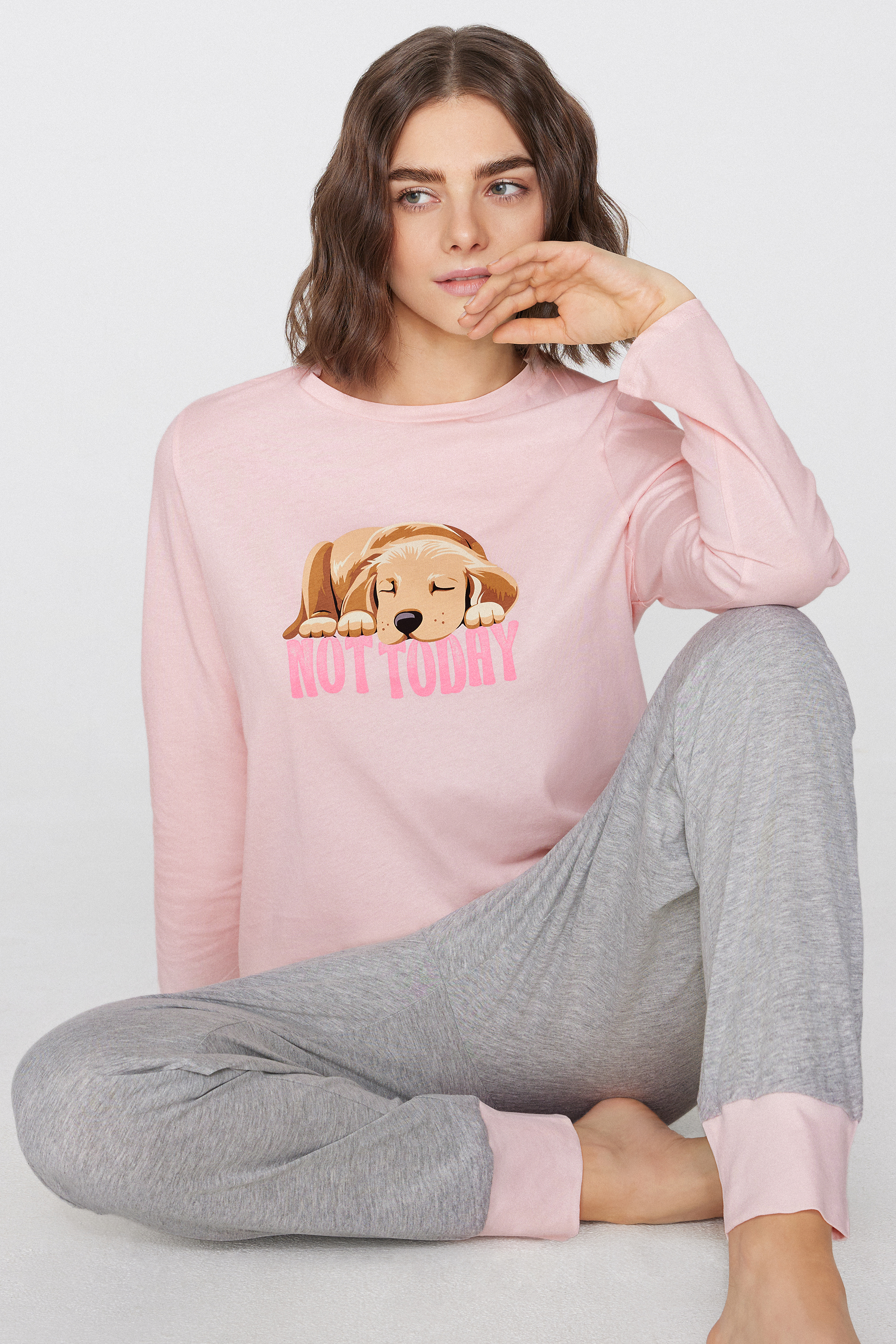Long cotton pyjamas with round neck, cuffed ankles, dog print and lettering.